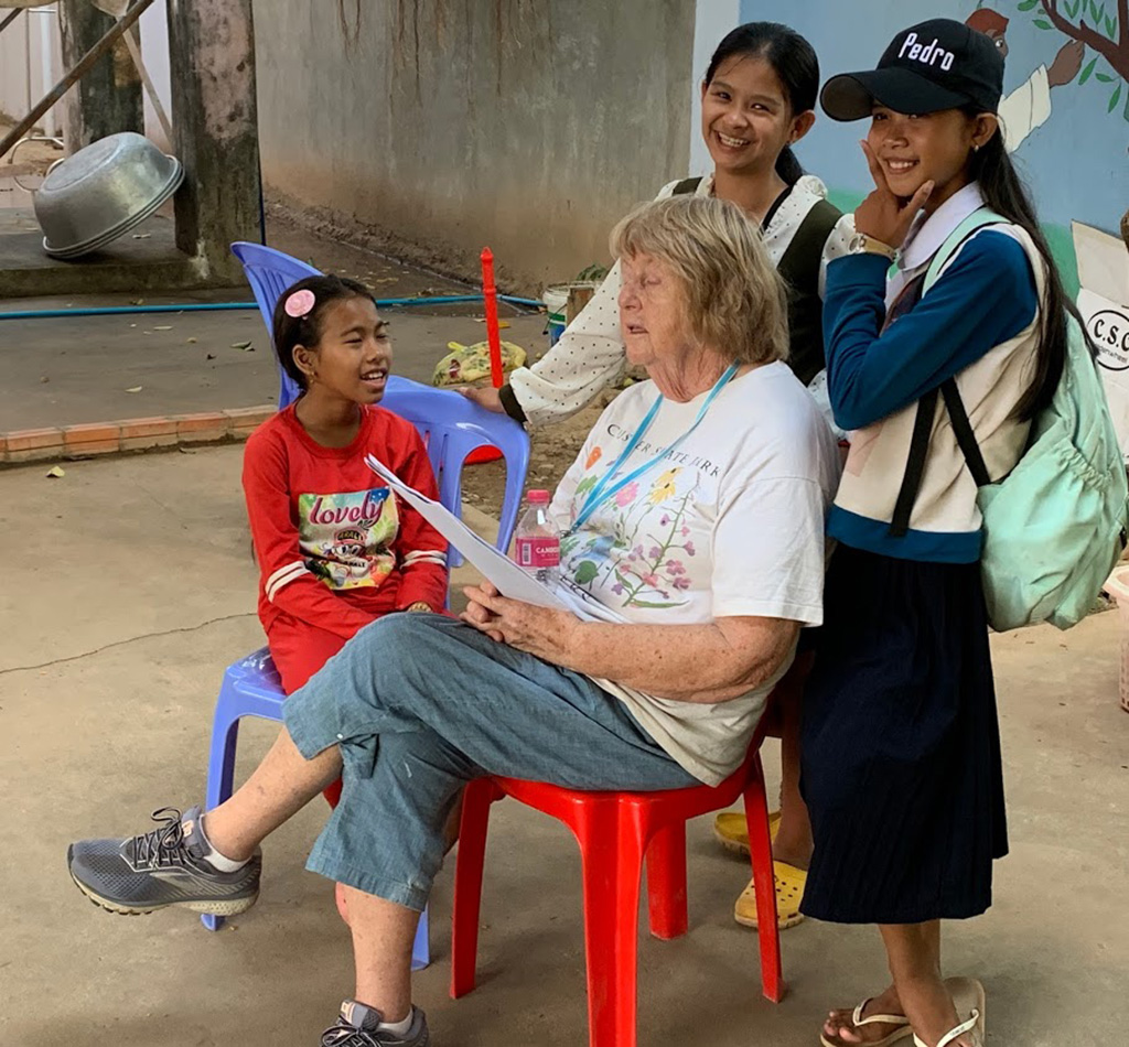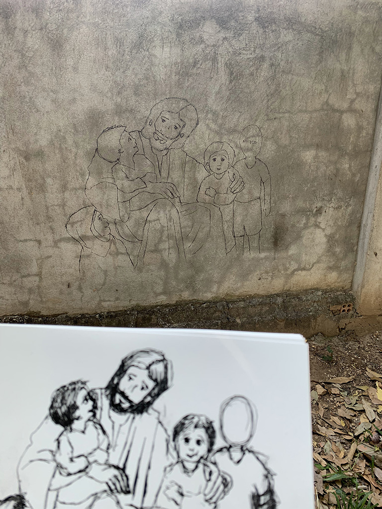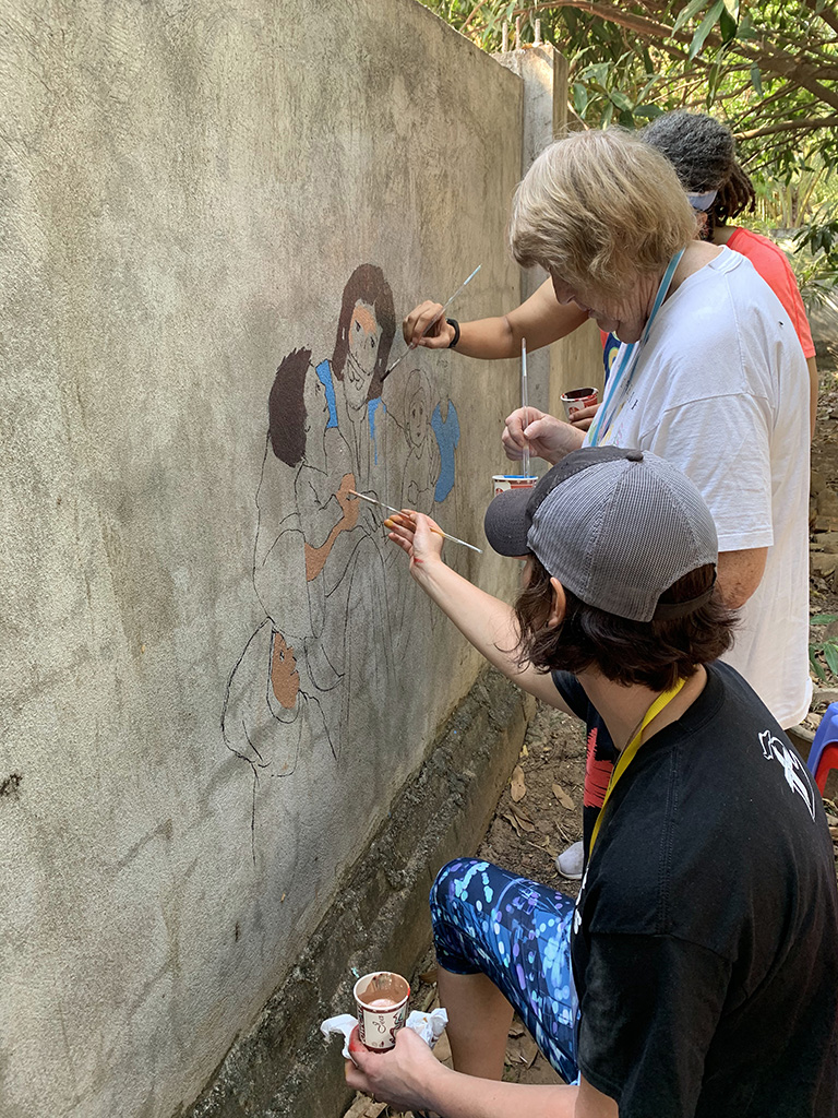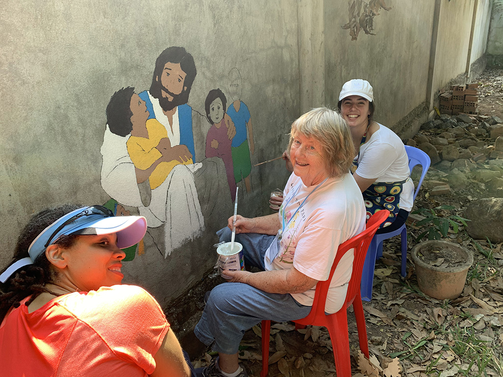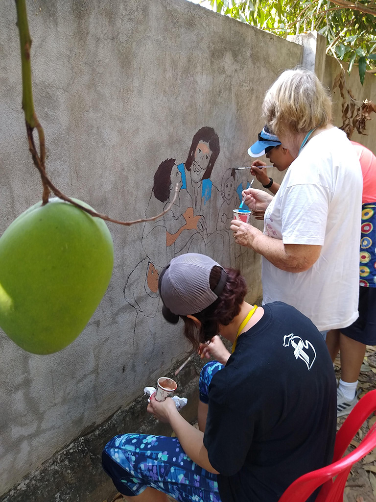 Today was our second day at Stronghold Cambodia and we split into groups to complete some chores at Stronghold. When we arrived around 8:30 am, Julie, Mary Ann, and Lindy jumped right into transferring Julie’s sketch for the first mural on the wall. Once it was outlined, the painting began! Meanwhile, Bruce and I painted some fresh white lines on the cement to mark out a volleyball court and Pastor Kempin put whiteboards up in the classrooms.