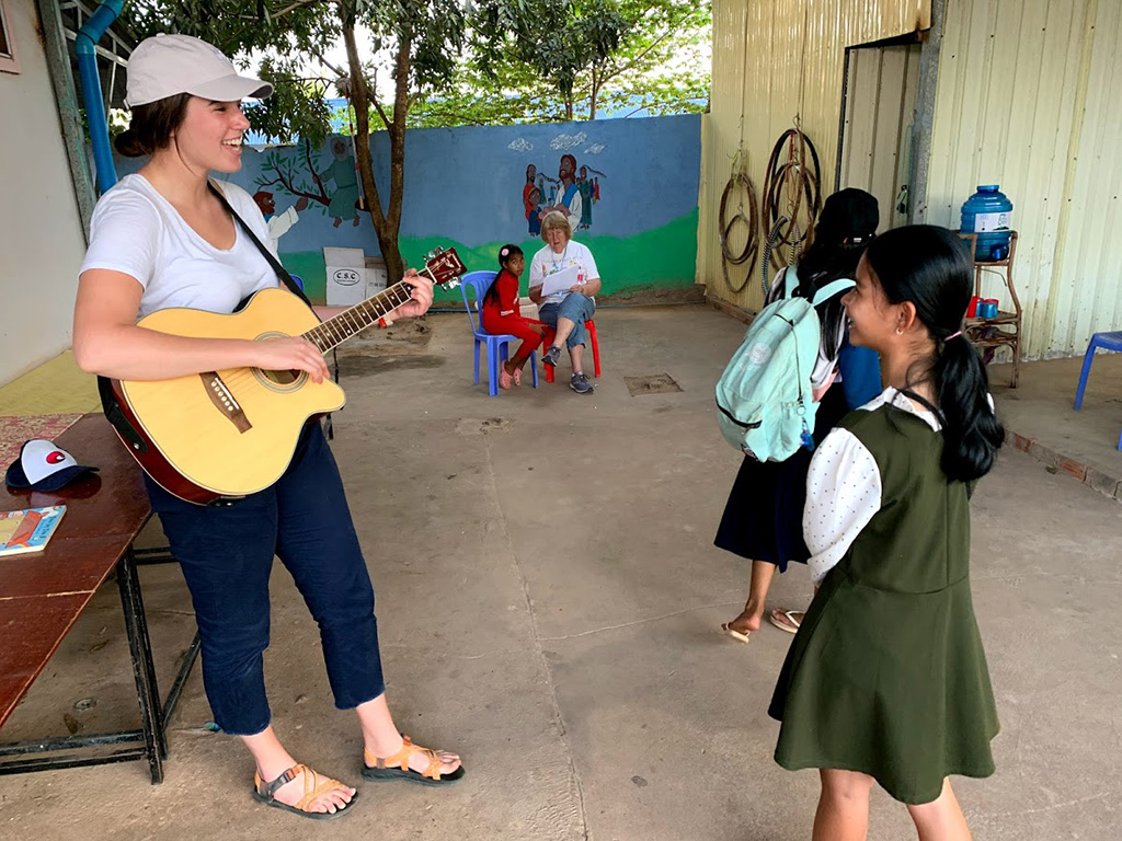 Students began arriving before we knew it. We helped serve lunch (rice, sauteed bok choy with pork, and fresh dragon fruit) before enjoying it along with the students. Fifteen minutes before English class started, Bruce shared a devotion. He used something he loves, fishing, to share the Gospel! Each student received a “Gospel fly” pin. The Gospel fly was made of different colors to share the story of our salvation in Christ. I led them in a beloved song by St. John’s students, “Shake Another Hand.”